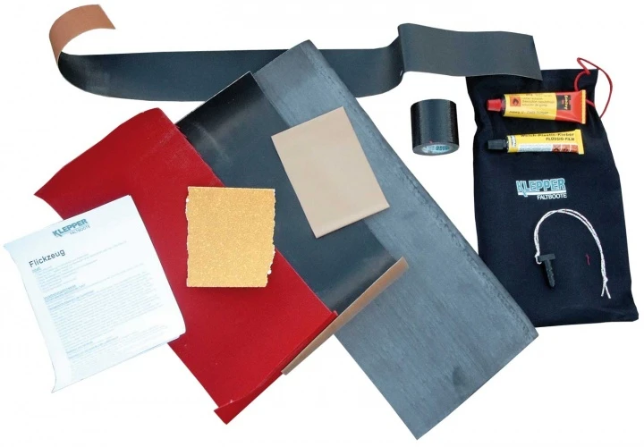 Inhalt: Stücke von Kielstreifen, Bootshaut, Verdeckstoff, Sandpapier, Rolle Gewebeband, Stöpsel für Luftschlauch, Tube Gummilösung (bzw. Kleber für PVC oder TPU), Tube Kleber für Seitenluftschlauch.
