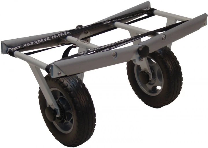 Stabiler, leichter Bootswagen aus eloxiertem Aluminium und V2A. Nach dem Lösen der Räder lassen sich die Radhalter einklappen. Z.B. für Expeditionen kann das Packmaß durch Auseinanderschrauben verkleinert werden.